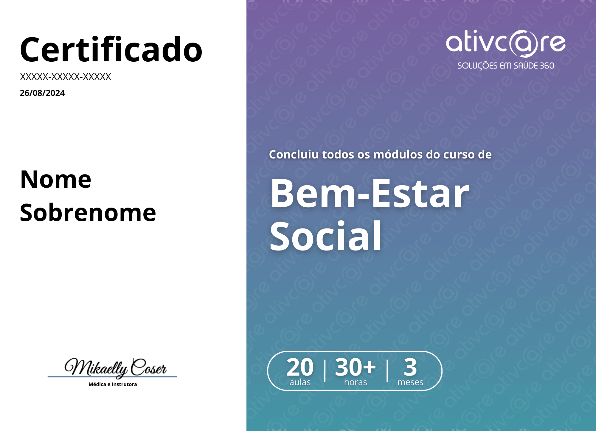 Nosso curso de Bem-Estar Social foi desenvolvido para aprimorar as interações no dia a dia corporativo, destacando a importância das conexões humanas para a saúde mental e física. Ao participar, seu colaborador aprenderá técnicas de comunicação eficazes e estratégias para construir relacionamentos significativos, criando uma rede de apoio que não só melhora a qualidade de vida, mas também fortalece o bem-estar mental e físico. Junte-se a nós para transformar as interações sociais da sua equipe e promover um ambiente mais saudável e equilibrado.